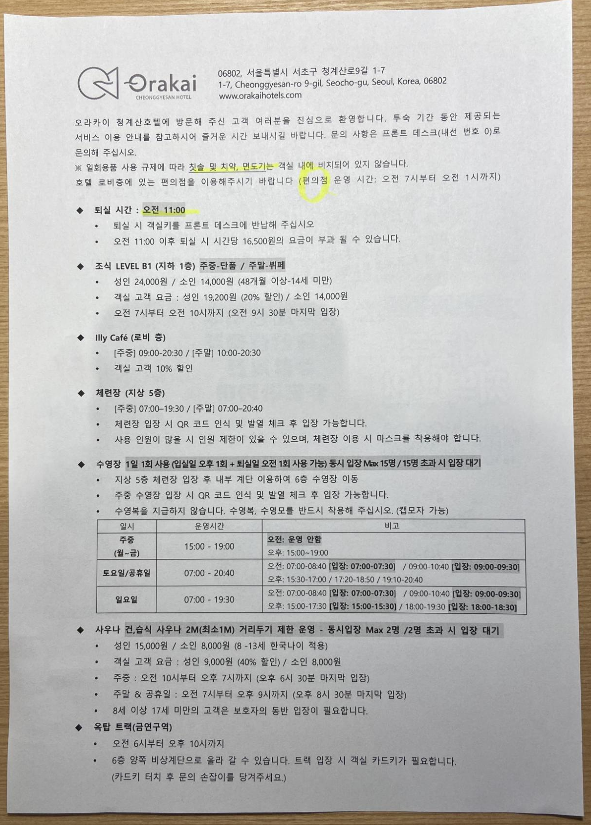 체크인을 하고 호텔 이용 안내문을 받았어요.