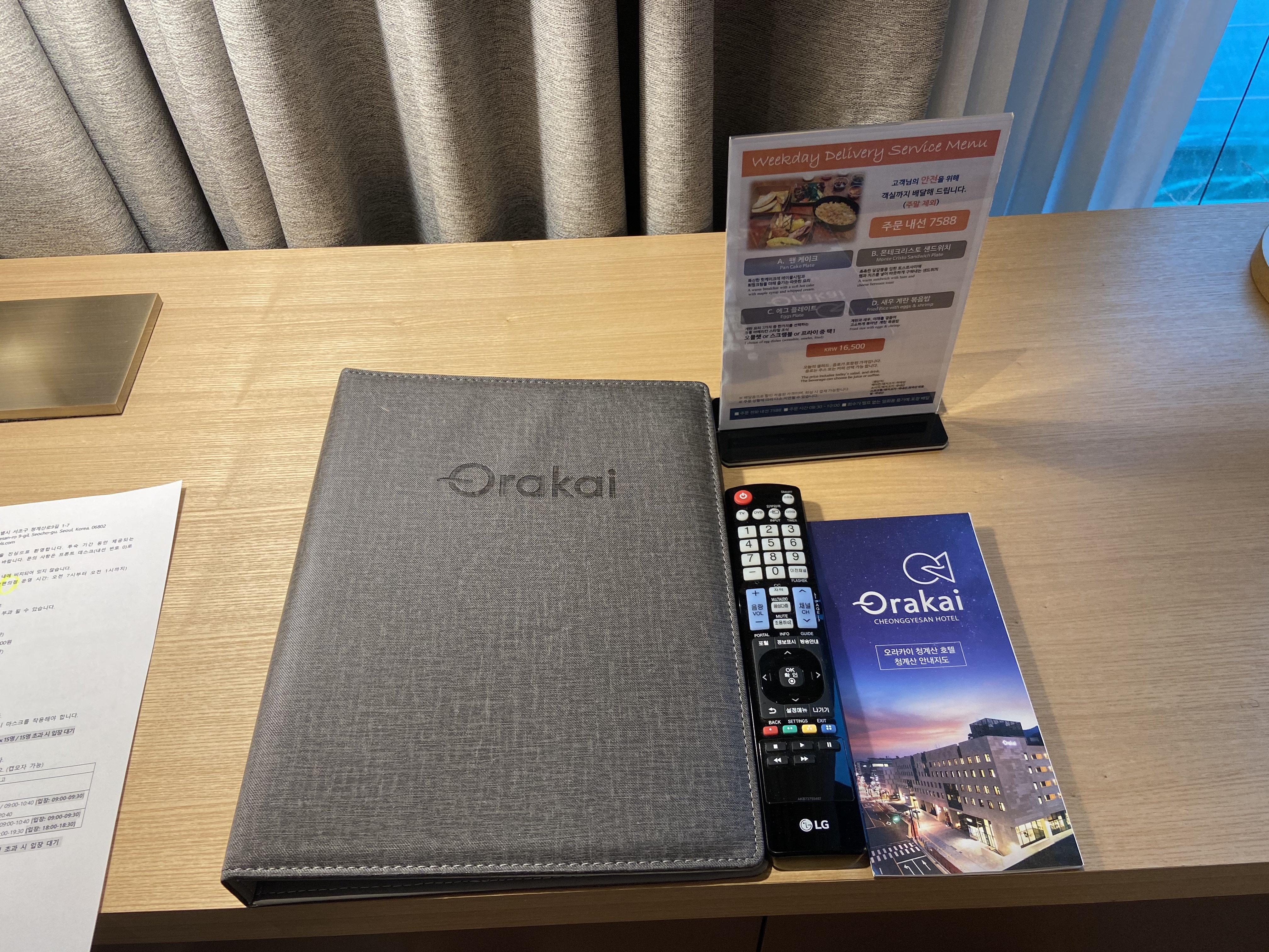 보통 호텔 객실은 책상이 벽을 바라보고 있는 경우가 많은데, 오라카이 호텔은 창문을 바라보고 있지요 :)
