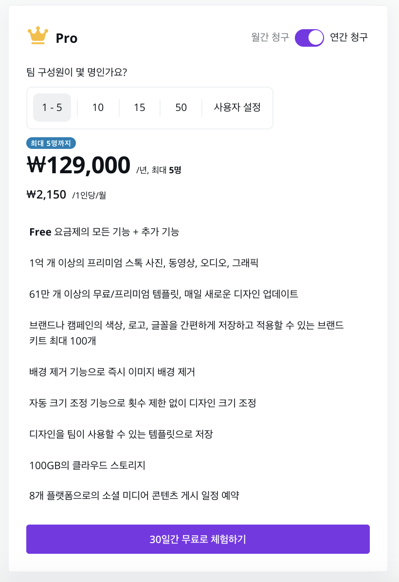 다행히(?) 캔바에서는 처음 30일간 무료로 체험해볼 수 있는 기회를 주고 있어요🙌