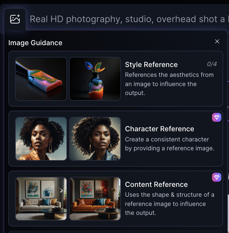 프롬프트 입력시에는 스타일 참조, 캐릭터 참조, 구도 참조 등의 기능을 사용할 수 있어요.