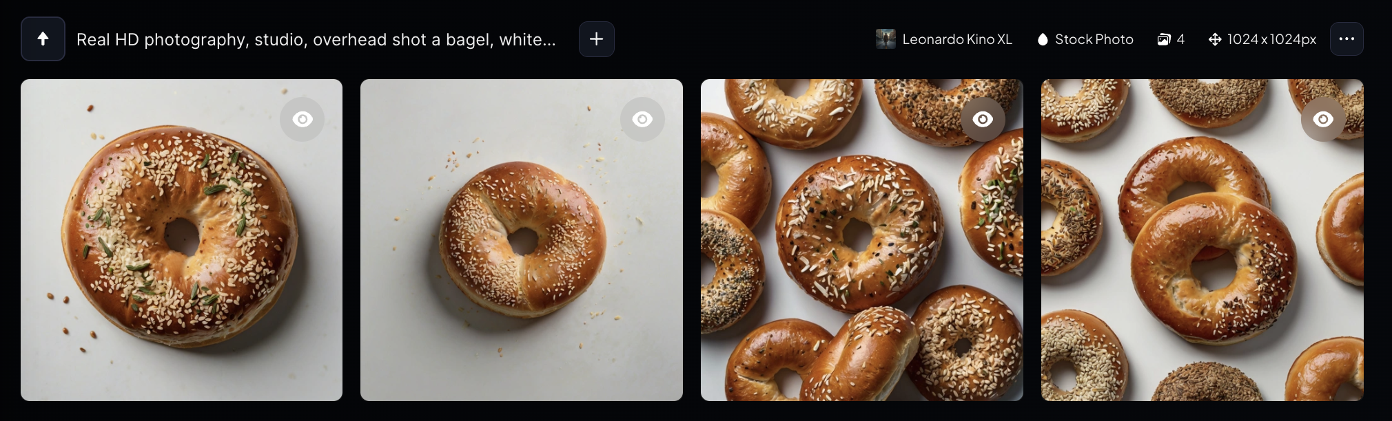 저는 프리셋 중 Stock Photography 를 선택하고, AI 프롬프트의 도움을 받아 이런 베이글 사진을 만들었습니다.
