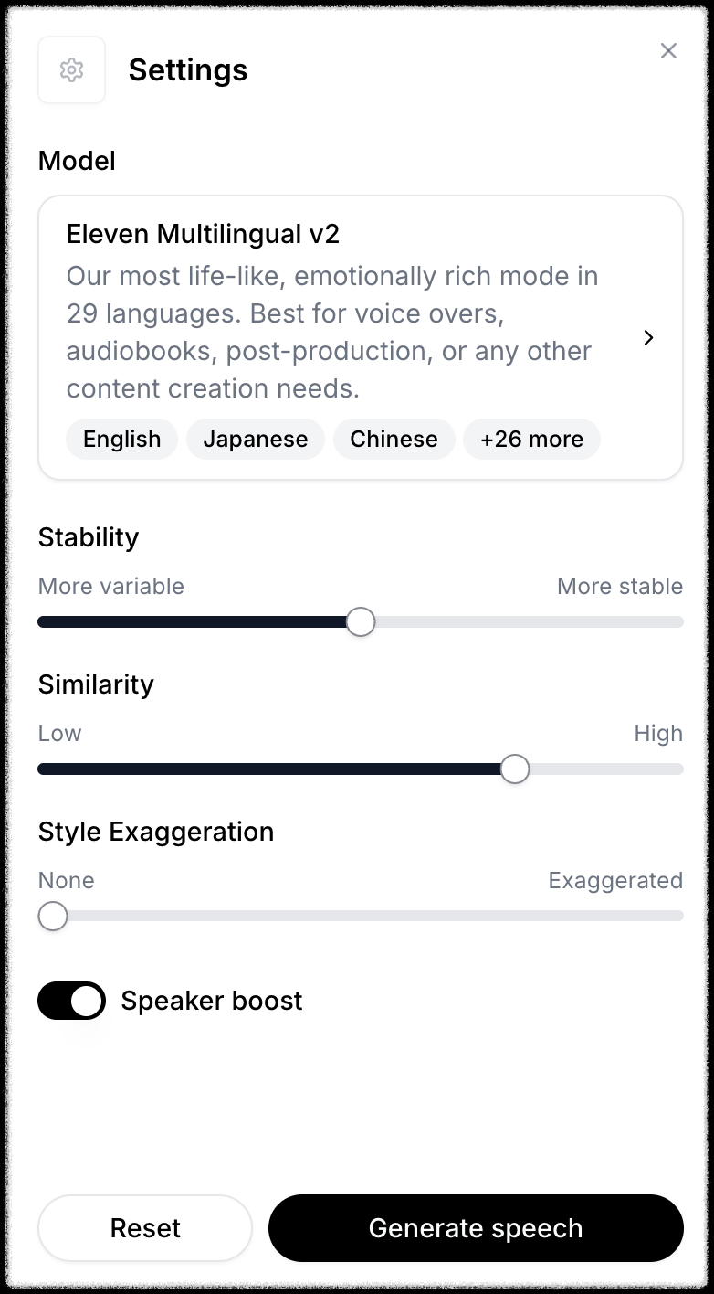 Settings 메뉴에서 Stability(안정성), Similarity(유사성), Style Exaggeration(스타일 과장) 등의 팩터를 조정할 수 있습니다.