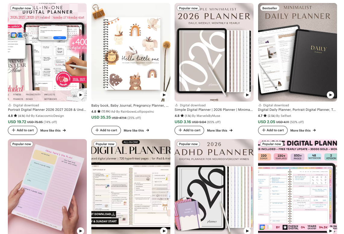 여기서 많은 분들이 "어떤 카테고리가 가장 잘 팔리는지" 궁금해하실거에요. 대표적으로 엣시에서 잘 팔리는 아이템들이 있습니다. 위에서 언급한 wall art, planner, 각종 template, clipart, mockup 등등..