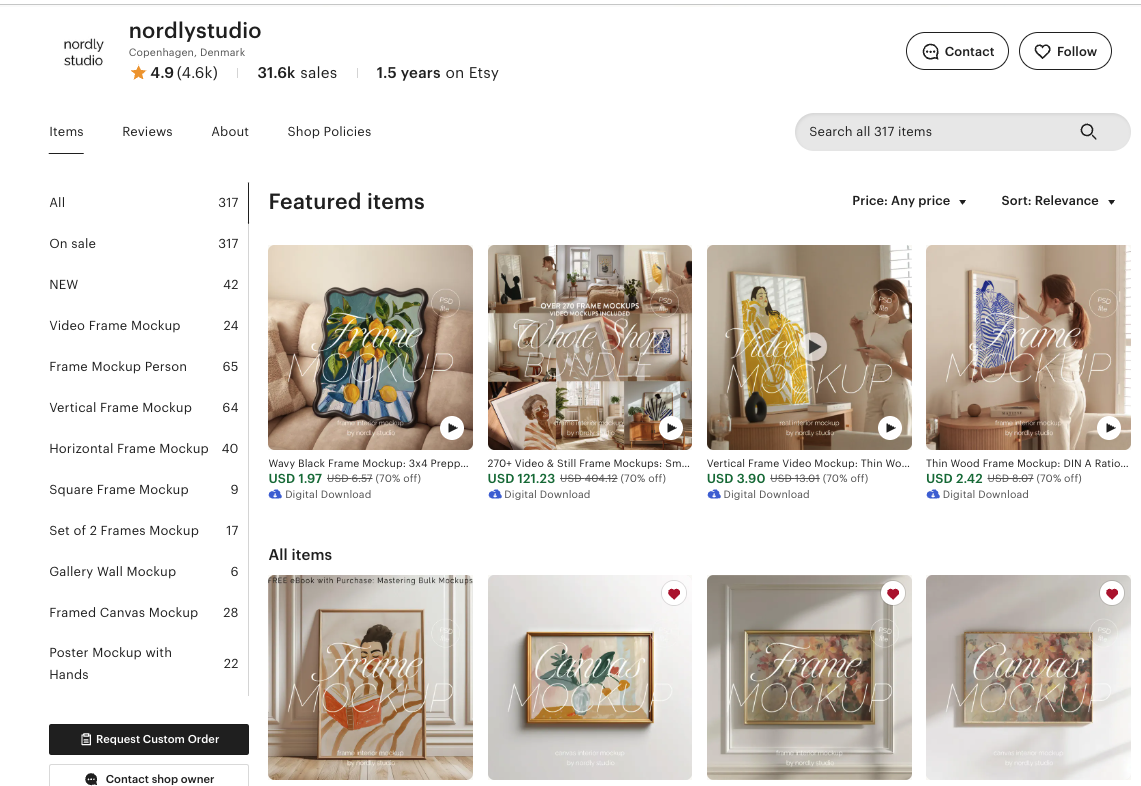 구체적인 예를 들어볼게요. 저는 PSD 액자 목업을 엣시에서 자주 구매합니다. 저의 취향은 미니멀한 뉴트럴톤의 목업인데요, 이렇게 목업을 사야겠다고 마음먹는 순간 제 머릿속에 딱 떠오르는 샵이 하나 있습니다. 그 샵에는 제 취향의 다양한 액자 목업들이 있고, 가격도 적당합니다. 그래서 저는 검색창에 목업을 검색하는 대신 곧바로 그 샵으로 가서 구매합니다.