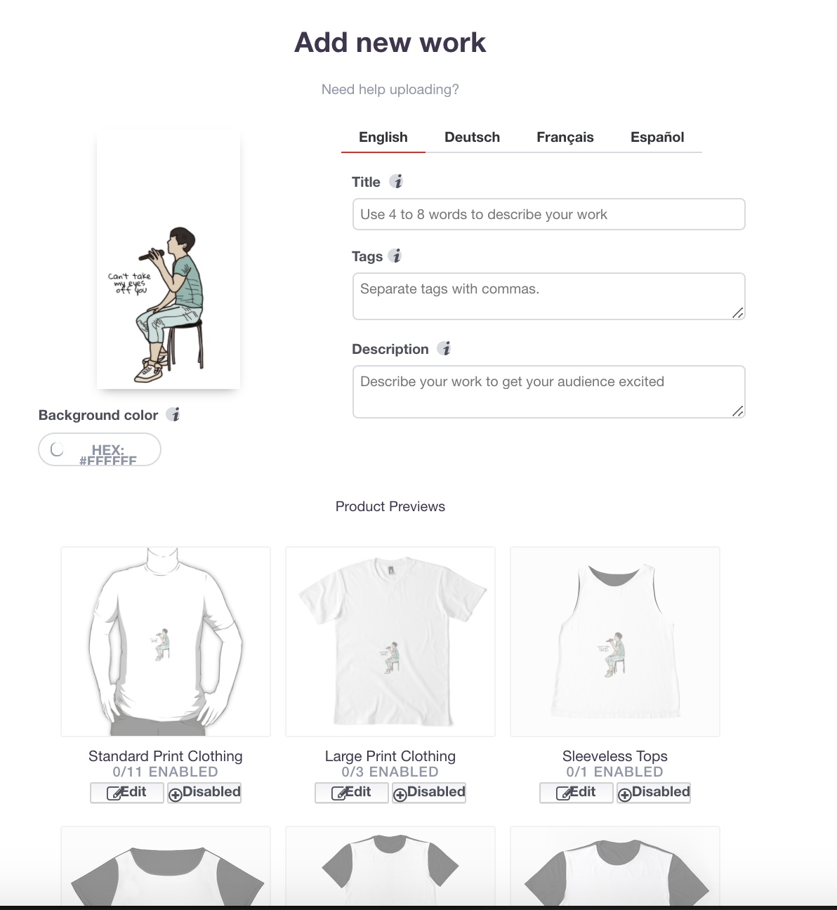원하는 파일을 업로드하고 나면, 업로드한 디자인으로 판매할 상품 목록을 확인할 수 있다. 목록에서 만들기를 원하는 제품은 Disabled 라고 적힌 버튼을 누르면 Enabled로 바뀌면서 상품이 생성된다.