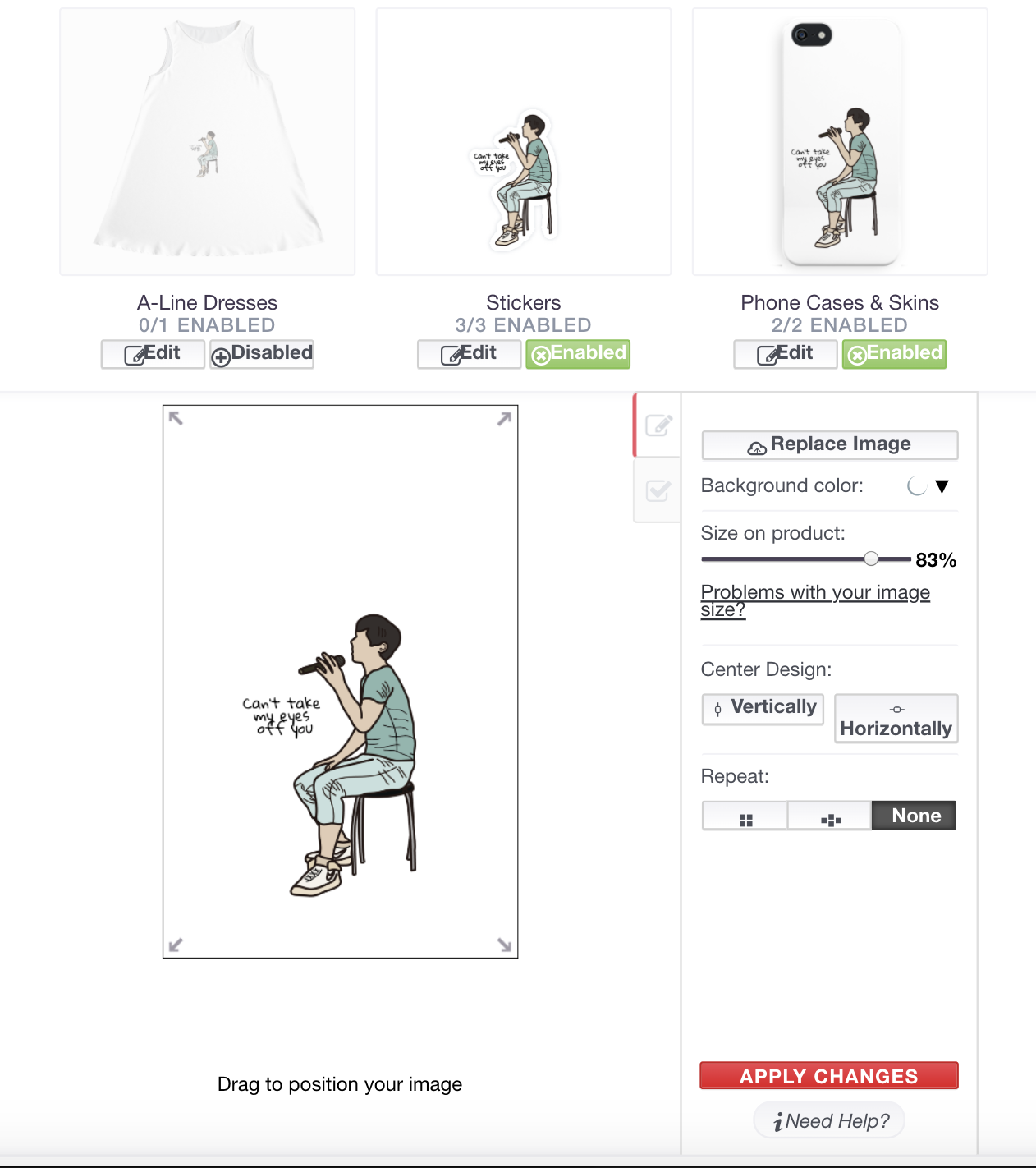 그리고 디자인을 한 번 업로드하여 여러 개의 상품에 바로 적용할 수 있고, 다시 각 상품별로 세부 조정이 가능하다.