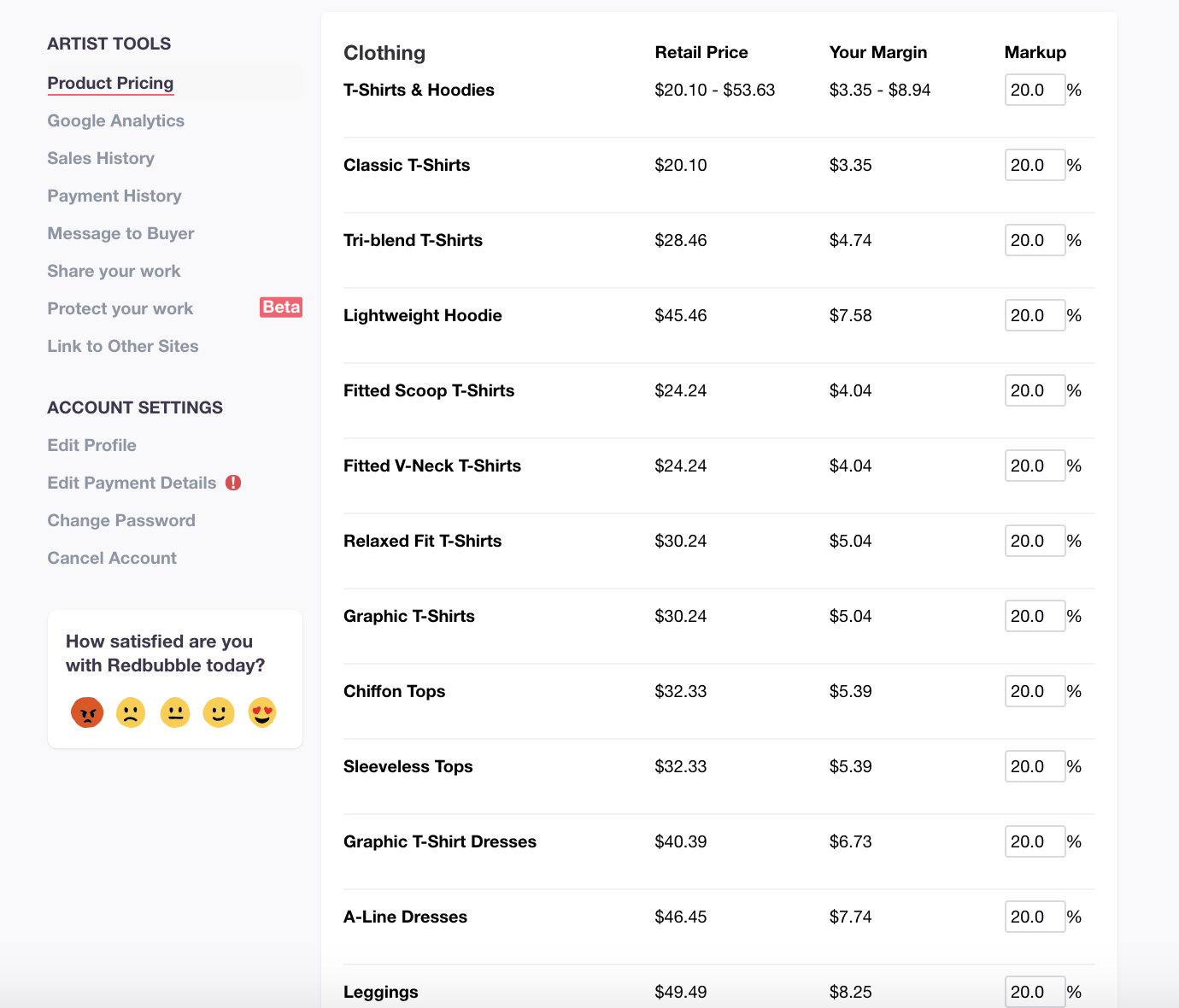 판매 가격은 기본적으로 내가 20%의 수익금을 가져갈 수 있도록 설정되어 있는데, 이것은 Account Details -> Product Pricing에서 Markup %를 조정하여 바꿀 수 있다. 당연한 이야기지만, 나의 수익금 비율이 높아지면 상품의 가격도 높아지고, 낮아지면 상품의 가격도 그만큼 싸진다.