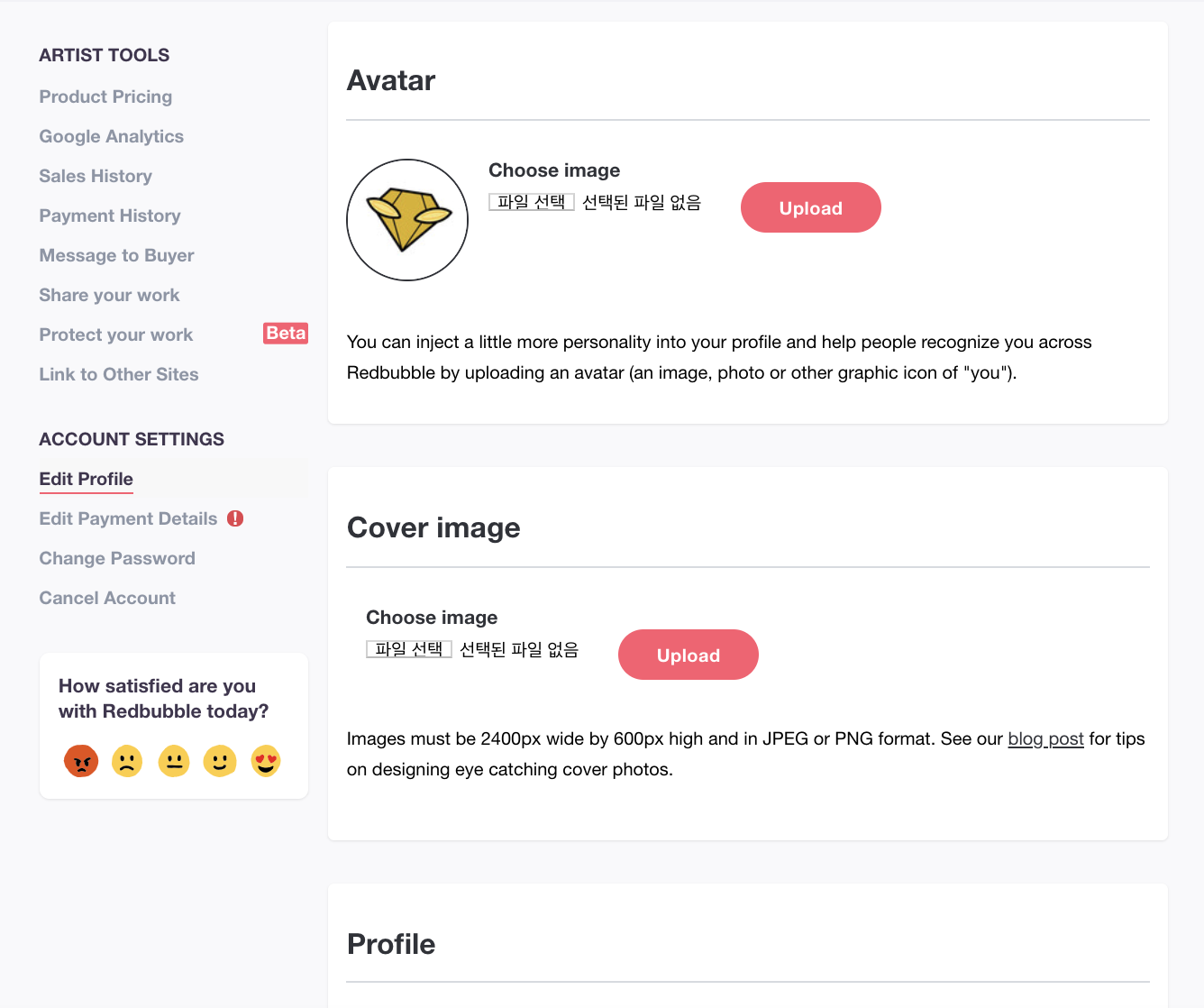 Edit Profile에서 프로필 사진, 나의 Redbubble shop 페이지에 보일 Cover image를 등록하고 아래에 기본 프로필 정보를 입력한다.