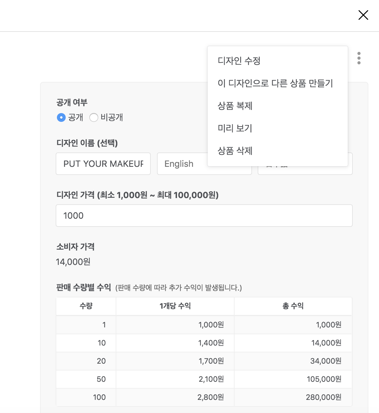 상품 만들기를 누르면 팝업창이 뜨는데, 여기서 상품 이름, 디자인 가격(나에게 떨어지는 수익), 상품 상세 설명 및 관련 SNS 주소를 넣어 상품 정보를 완성할 수 있다.