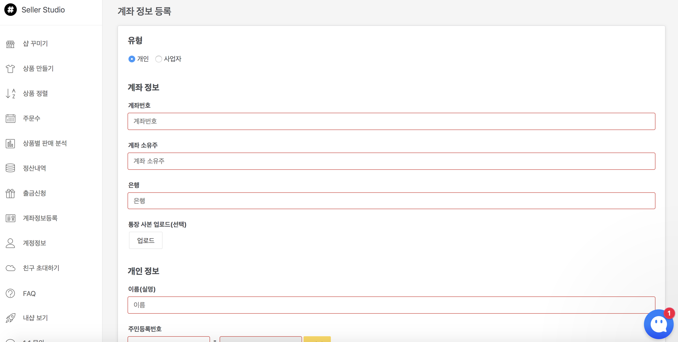 상품 등록도 좋지만, 상품 판매가 되었을 때 수익금을 정산받을 계좌 정보를 등록하는 것도 중요하다.