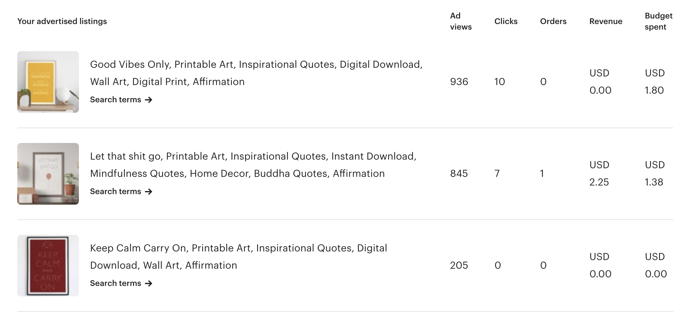Etsy Ads를 하루에 1불씩, 약 3일 실행해본 결과, 개인적으로는 기대했던 것보다 매우 만족스럽다.