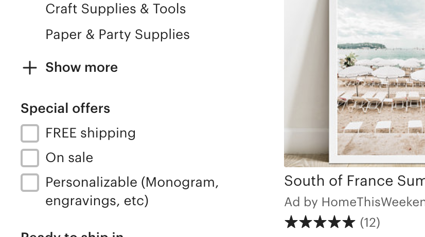 할인이나 무료 배송을 제공하면 검색 결과에서 경쟁 업체와 차별화될 수 있습니다. Etsy의 판매 및 쿠폰 도구(sales and coupons tool)에서 무료 배송을 제공할 수 있습니다.