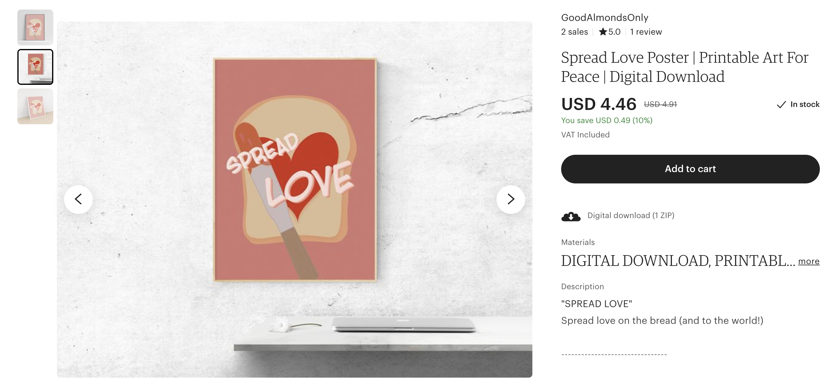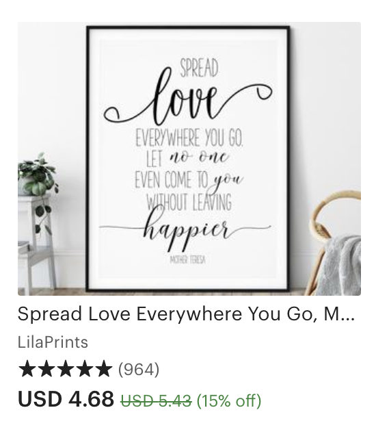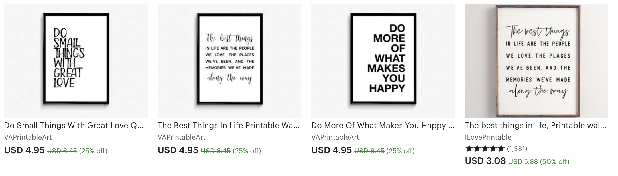 또한, Etsy는 미국 내에서 광고하는 모든 곳 (이메일 마케팅, 소셜 미디어 및 텔레비전 광고)에서 이러한 상품들을 우선시합니다. 디지털 다운로드 항목은 배송 비용이 없기 때문에 Etsy 앱에서 우선 순위 검색 배치에 적합합니다. 만약, 현재 미국 내 무료 배송 보증 또는 미국 내 구매자에게 무료 배송을 제공하고 있지 않다면, 이를 무료 배송으로 전환하거나, 해당 국가에 대한 배송비를 낮추면 상품의 노출 순위가 높아질 수 있습니다.
