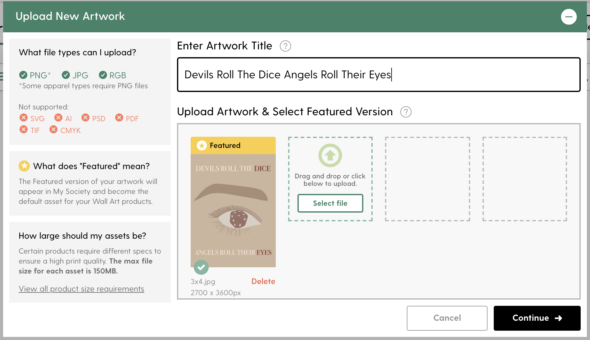 업로드 가능한 파일 형식은 PNG, JPG, RGB 세 가지이고, 파일 용량은 150MB를 넘으면 안 된다.