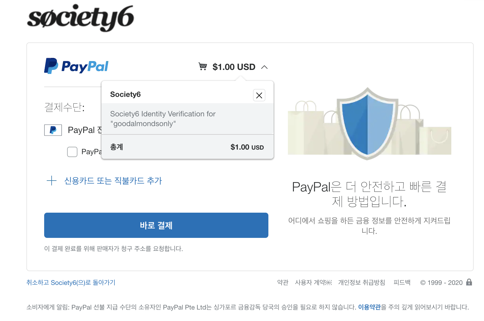 Society 6 신분 인증을 위해서는 1딸라가 필요하다고 한다.. 왜 원딸라를 달라는 건지는 모르겠지만 일단 시키는 대로 해본다.