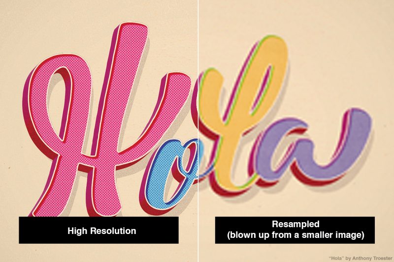 디자인 세계에서 잘 알려진 규칙은 아트웍의 픽셀 크기를 디지털 방식으로 늘리지 않는 것입니다 (이를 “리샘플링”이라고 하며 널리 권장하지 않음). 아래를 참조하십시오.