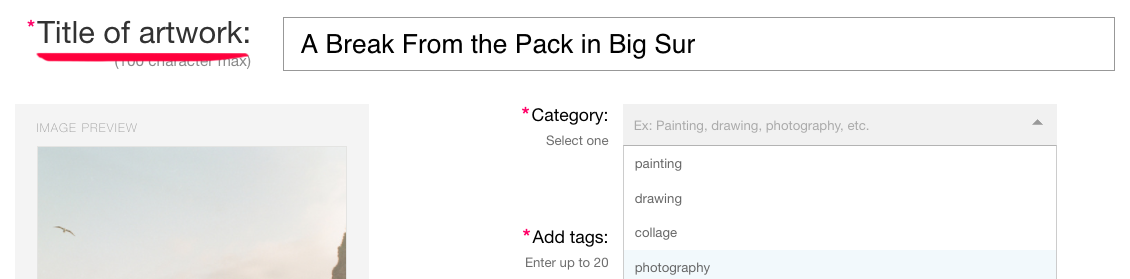 제목이 다른 사람이 검색하는 내용에 가까울수록 검색 결과에 더 많이 나타납니다. 위의 작품 이름을 "Flying Solo"로 정하고 설명이나 태그에 "Big Sur"를 추가하지 않은 경우 "Big Sur Wall Tapestries"를 검색하는 사람은 이 작품을 아무데서도 찾지 못할 것입니다. (*Big Sur는 미국 캘리포니아에 있는 유명한 해안 관광지입니다)